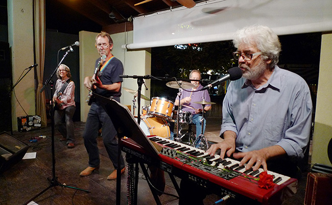 Mitzi Cowell on guitars, Karl Hoffmann on bass, Les Merrihew on the skins, and Gary Mackender on squeezebox and piano. |